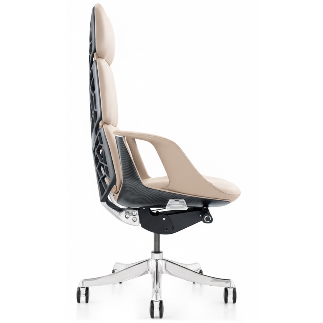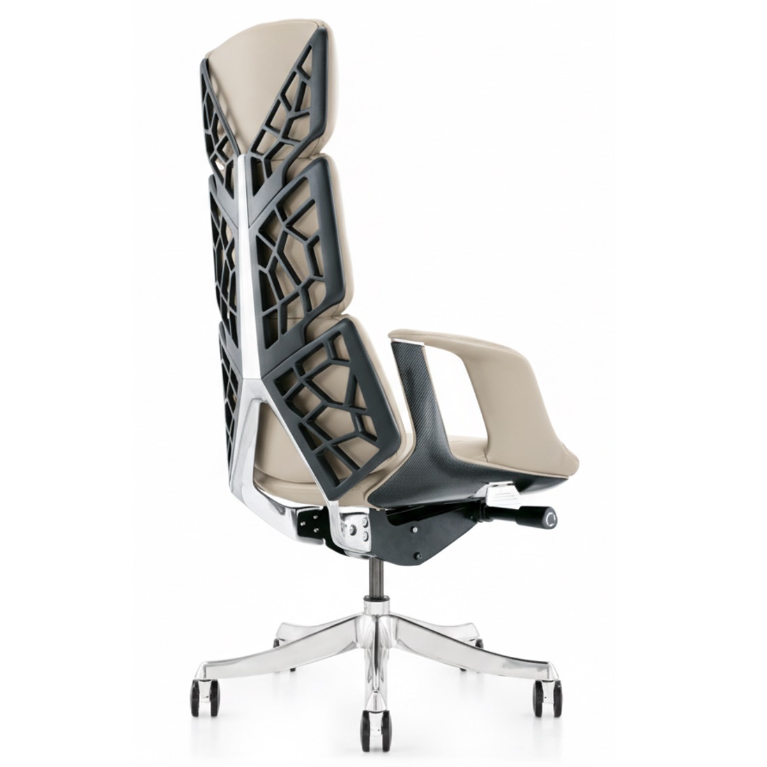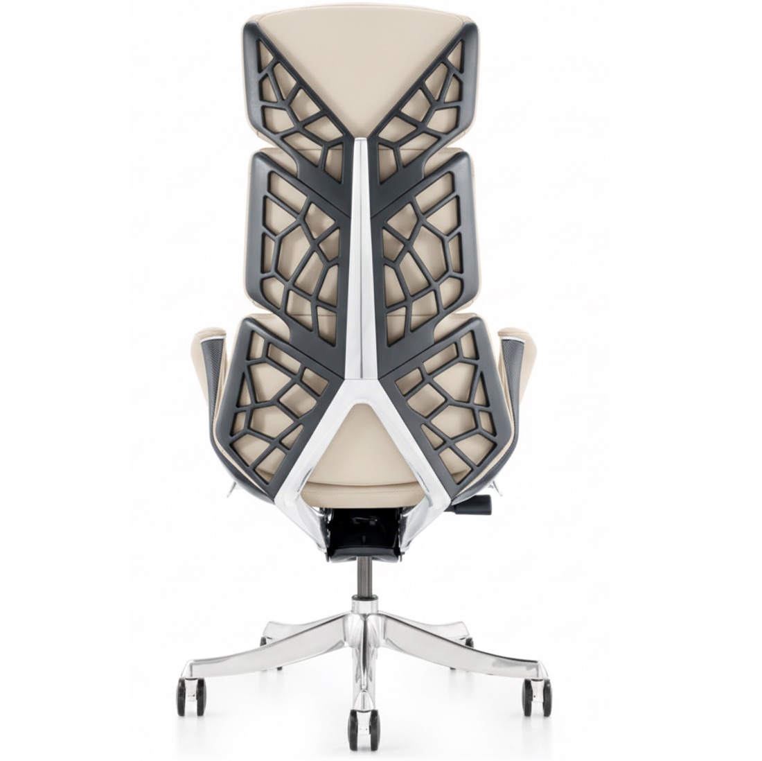 This chair blends a biomorphic lattice backrest (inspired by natural skeletal structures) with plush upholstery—striking a balance between dynamic visual texture and long-hour support. The contrasting color scheme (neutral tones + geometric black frames) merges modern aesthetics with functional ergonomics, making it a statement piece for workspaces that value both style and well-being.